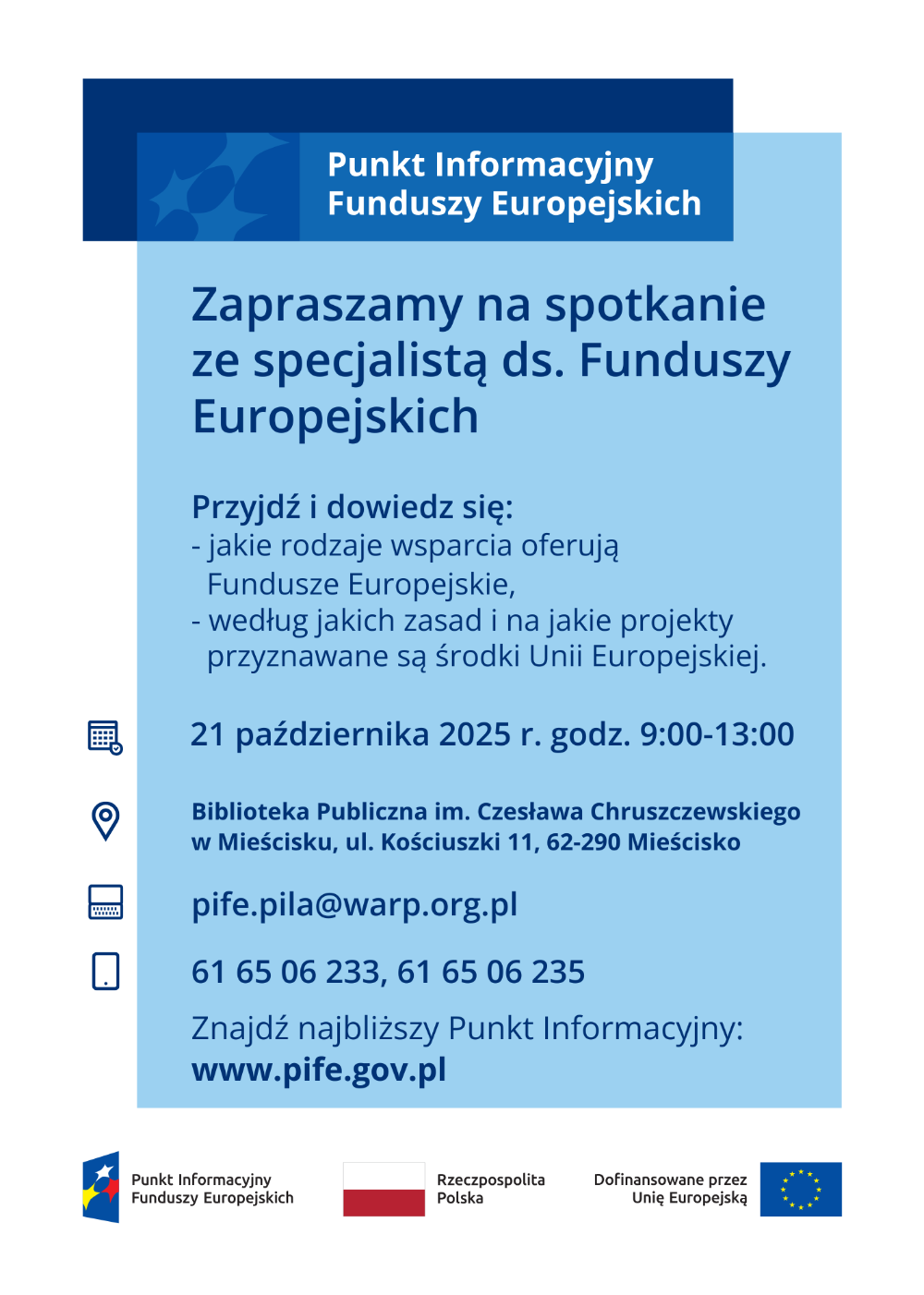 Punkt Informacyjny Funduszy Europejskich w Pile organizuje w dniu 21.10.2025 r. Mobilny Punkt Informacyjny w: